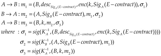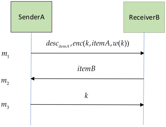 Figure 1 shows the interaction process of the Syverson protocol, where and represent the sender and receiver of the protocol, respectively. In this protocol, the items exchanged by the two parties are marked as and , where is a description of , is an encryption algorithm that encrypts the message with key , and is a temporary secret commitment function used to keep the message confidential for a certain period of time (see reference [11] for details).