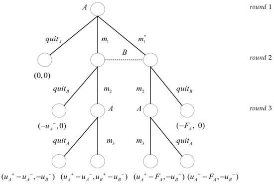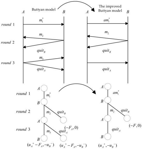 Figure 2 shows the game tree description of the Syverson protocol by the Buttyan model. The nodes represent the participants of the protocol, and the lines between the nodes represent the actions taken (sending messages or exiting the protocol). Participants will have corresponding benefits at each leaf node (see reference [11] for details). In the first round of interaction of the Buttyan model analysis protocol, participant can not only transmit true information to participant but also send false message . Once sends a false message to , will always be punished by . This means that the Buttyan model presupposes that participants can identify all false messages. It only focuses on those false messages that participants can detect, without fully considering those that are not identified. In the actual operation of the protocol, participants’ detection capabilities may be limited by technology. At the same time, attackers continuously develop new attack methods and tools. These new methods and tools may not be widely recognized for a period of time, making it difficult for participants to update their detection mechanisms in time to identify these new types of false messages. Therefore, in reality, it is not possible to expect all false messages to be identified by participants . This limitation means that the Buttyan model needs further development and improvement.