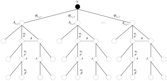 To highlight the improvements of the model, we introduce the types and beliefs of the participants based on Figure 1, as shown in Figure 3. Nature randomly assigns types to participant , where , , …, represents the probability of assigning each type (Equation (3)), , , …, indicates that participant has types, and , , represent the probabilities of sending messages , and . During the protocol analysis, the network can be regarded as a participant of a specific type, and its behavior (such as the reliability of message transmission) can be uncertain. In the game tree, the leaf nodes symbolize the end of the protocol, while the other nodes (except for leaf nodes and Nature ) represent the decision points of the participants in the game process. The dashed lines indicate that participant does not know the actions or strategy choices of participant , reflecting the uncertainty of the game.