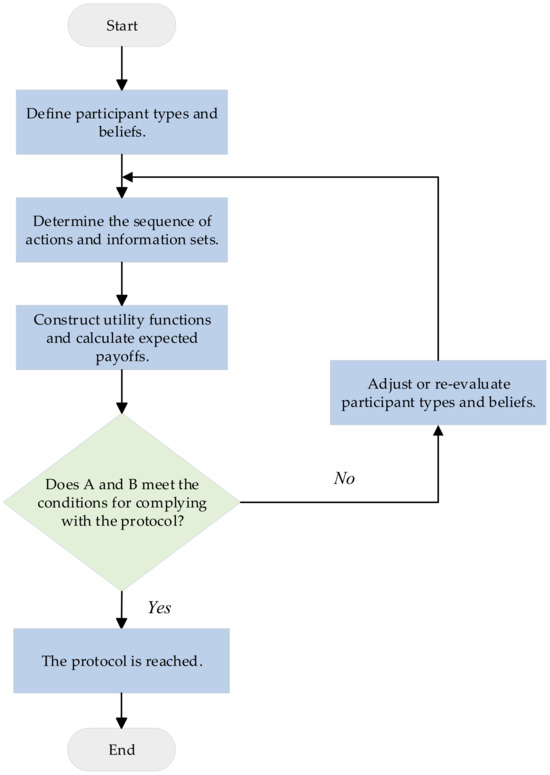 The flowchart describes the process of protocol analysis: starting from the “Start” node, first define the participant type and belief, then determine the sequence of actions and information sets, then build the utility function and calculate the expected return, and then check whether participants and meet the conditions for complying with the protocol. If they do, the agreement is reached and the process ends; if not, it is necessary to adjust or re-evaluate the participant type and belief and then return to redetermine the sequence of actions and information sets until the conditions are met.