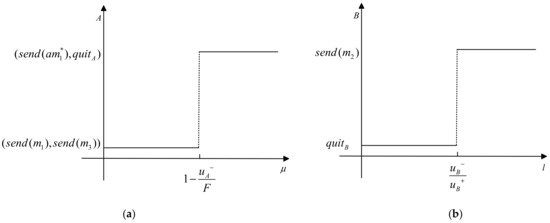 The following are the strategy diagrams for participant under parameter and participant under parameter , as shown in Figure 8. (a): When , participant adopts the pure strategy . (b): When , participant adopts the pure strategy . Both parties interactively sign and reach an agreement.