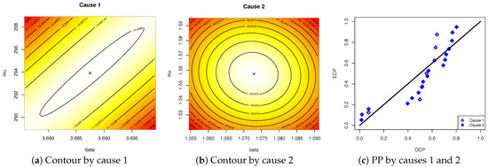 where , for , represents the latent failure time of the i-th testing unit under the j-th cause of failure. Additionally, it is assumed that the latent failure times and , for , are independent. When a failure occurs, the researcher records the failure time and identifies the specific cause of failure, denoted by the indicator variable , with , where if the i-th failure is attributed to the first cause, and if it is due to the second cause. This indicator variable helps identify the specific risk factor responsible for each observed failure. Assume that , follows the IW distribution with scale parameter and shape parameter , and it will be referred to as . Then, the associated probability density function (PDF) and distribution function, can be written, respectively, as
