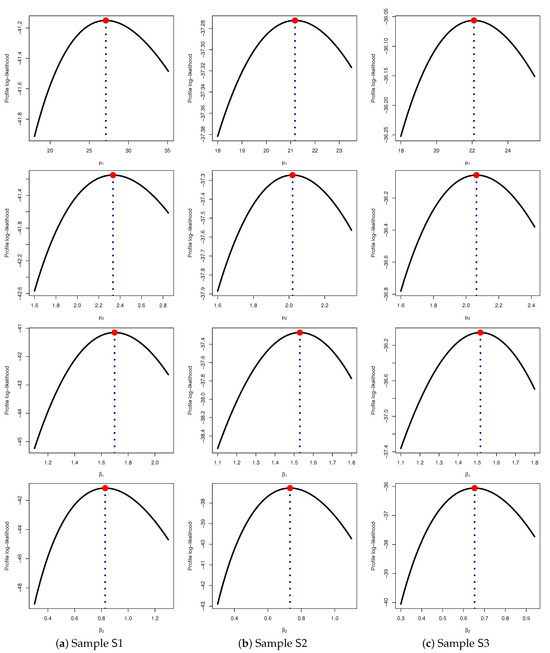 where is the critical value from the standard normal distribution corresponding to the significance level , and is the estimated variances, obtained from the diagonal elements of . It is important to mention here that this method relies on the large-sample properties of MLEs, ensuring that the intervals are asymptotically valid and provide reliable estimates of the parameter uncertainty. However, for small sample sizes, the accuracy of these intervals may be limited, and alternative methods such as Bayes credible could be considered for improved performance.