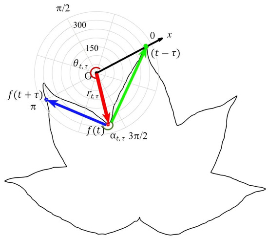 where and respectively indicate the modulus and argument of complex number. The polar angle and turning angle are constrained in the range . Figure 2 shows an illustration of LPCF on the LPC system, including the radial distance (red line), the polar angle (red arc), and the turning angle (green arc) of the contour point .