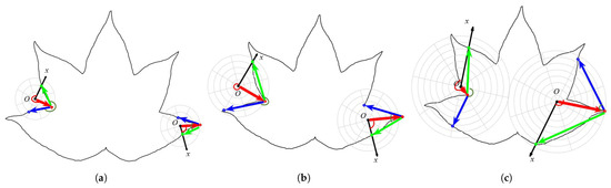 The LPCF of different scale levels. The red line, red arc, green arc, and the blue and green lines represent the radial distance, polar angle, turning angle, and adjacent chords, respectively. Figure 4a–c display the LPCF at three different scale levels: (a) The fine level ( = 2). (b) The intermediate scale level ( = 4). (c) The coarse scale level ( = 8).