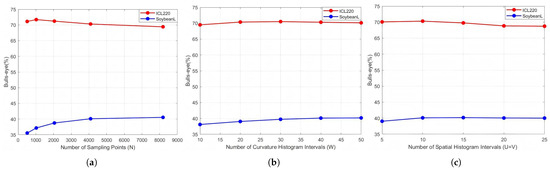 Retrieval performance curves of the LPCFR under different parameter settings on the ICL220 leaf subset and lower part of SoyCultivar200 datasets. Figure 6a–c display the LPCFR retrieval performance of each parameter under keeping the other parameters fixed: (a) and . (b) and . (c) and .