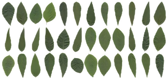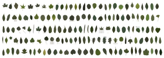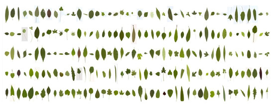- ICL220. The ICL220 leaf dataset [8] is a classic database, primarily designed for assessing the performance of plant recognition methods. It is collected from 220 plant species, each of which involves at least 26 leave images. All the images have a resolution of approximately 250 × 500 pixels and exhibit low intra-class variation alongside medium inter-class similarity. Here, the same equal set is adopted as in this paper [45], namely, taking the first 26 leaf images from each species and discarding the remainder for obtaining the ICL220 leaf subset with a total of 26 × 220 = 5720 images. Sample leaves from each species in the benchmark leaf datasets are displayed in Figure 7. Obviously, some leaves belonging to different species are very similar in shape.
