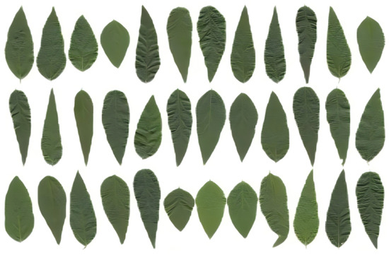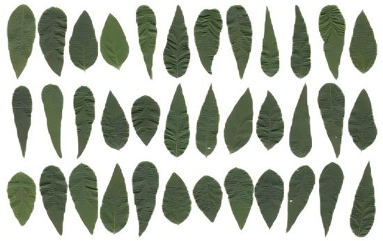 Figure 8. Sample leaves from each species on the MEW2012 leaf dataset. - SoyCultivar200. To further access the effectiveness and generality of the proposed methods, we perform retrieval experiments on the SoyCultivar200 [20] leaf dataset, which consists of three subsets. Each subset contains leaves collected from 200 soybean cultivars, with 10 leaf samples obtained from the upper, middle, and lower parts of each cultivar, respectively. The images possess a resolution of roughly 2000 × 3000 pixels and exhibit low variability within the same class, while showing a high degree of similarity between different classes. Figure 9, Figure 10, and Figure 11, respectively, show the sample leaves from the upper, middle, and lower parts of selected cultivars on the SoyCultivar200 dataset. It can be observed that the SoyCultivar200 dataset poses great challenges due to the high morphological similarity among different cultivars, which increases the difficulty of image retrieval. We conduct single leaf image pattern retrieval experiments on the three subsets. In addition, the 6000 leaf images are grouped into 2000 groups for joint pattern matching. These two retrieval tasks effectively reflect the performance of the proposed methods.