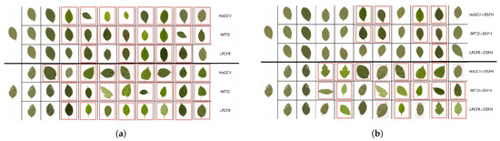 Some leaf image retrieval examples of three methods on the ICL220 leaf subset. The red rectangle indicates the retrieval error. Figure 12a,b display the retrieval results without and with fusion: (a) Before fusion. (b) After fusion.