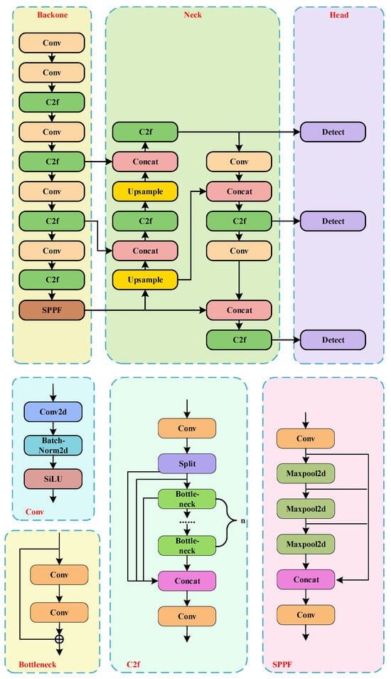 Backbone: The Backbone network in YOLOv8 extracts a multi-scale feature map from the input image. Backbone has three parts: Conv, C2f, and Spatial Pyramid Pooling Fast (SPPF). The Conv module has three functional components: Conv2d, BatchNorm2d, and the SiLU activation function. The C2f module draws on the design concept of the E-ELAN in YOLOv7. It enhances gradient flow and feature diversity through denser cross-stage connectivity and feature-splitting operations while maintaining lightweight flow information. This improvement significantly increases the convergence speed and model performance compared to the C3 module in YOLOv5. The SPPF module, which is based on SPPNet, improves computational efficiency and maintains the ability to extract features at different scales. It uses multiple sequential max-pooling layers with 5 × 5 kernels instead of just one large pooling operation like the original SPP approach [42].