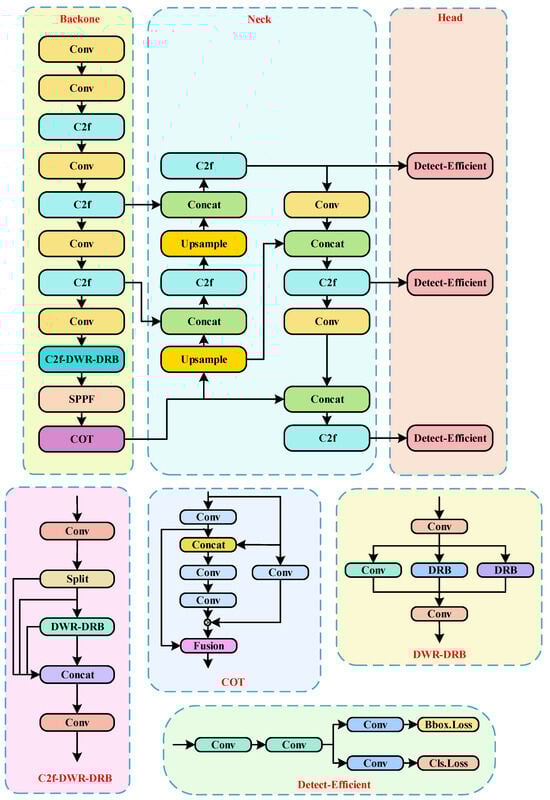 The COT attention mechanism focuses on enhancing the contextual relationships between different locations in the feature map. It captures relationships between features at the local scale and models long-distance dependencies at the global scale. The C2f-DWR-DRB module enhances the model’s ability to precisely detect and locate flaws of various sizes by effectively aggregating multi-scale contextual information. Global and local interactions are combined to enhance the expressive power of feature representations, enabling a richer portrayal of contextual information in intricate visual scenes. This improves the model’s accuracy in flaw detection.