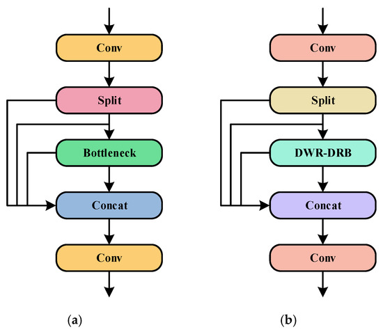 Comparison between module structures: (a) original C2f; (b) modified C2f-DWR-DRB.