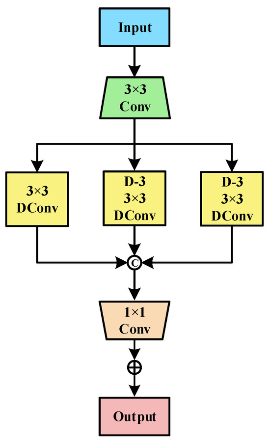The DWR (Dilation-wise Residual) [45] module adopts a residual connection architecture, as shown in Figure 4. This module divides the feature extraction process into two stages, regional residual and semantic residual, which efficiently capture multi-scale contextual information and integrate feature maps generated by multi-scale perception. First, the input features are preprocessed through a 3 × 3 convolution layer, followed by batch normalization (BN) and ReLU activation functions. This generates a series of feature maps of varying sizes, referred to as region activations. This stage primarily extracts local features, laying the foundation for subsequent multi-scale processing. In the second step, three 3 × 3 depth-wise convolution (DConv) layers with different dilation rates are used to simplify the convolution operation in the depth direction. This multi-dilation rate design constructs receptive fields of different scales. Small dilation rates focus on local detail features, medium dilation rates capture medium-range context, and large dilation rates model more global spatial relationships. Through this multi-scale feature fusion strategy, the module can better retain the filtering process of important information at different scales, which is called semantic reconstruction. Subsequently, a 1 × 1 convolution layer maps the concatenated high-dimensional features to a low-dimensional space, thereby reducing model complexity. Finally, residual connections are used to add the dimension-reduced features to the original input features, achieving feature reuse.