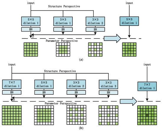 The DRB (Dilated Reparam Block) [46] module aims to extend the large kernel convolutional layer by merging the non-dilated large kernel convolution with many extended small kernel convolutional layers. Specifically, features are extracted from the input feature map using a non-dilated large kernel convolution and multiple dilated small kernel convolutions. Each convolutional layer learns a different representation of the features and sums the output features after their respective batch normalization (BN) layers. When converting the DRB module to a large kernel convolutional layer for inference, the output of each convolutional layer needs to be merged into the output of the large kernel convolution. This is converted into a convolutional layer with an expansion of r > 1 by a specific function with an appropriate amount of zero padding on both sides (ignoring input pixels in the inflated convolution is equivalent to inserting additional zero entries in the convolutional kernel). The size of the original convolution kernel is , and the convolution kernel after inserting zeros is called the equivalent convolution kernel, which has the size .