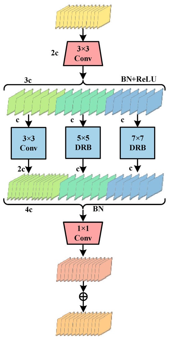It should be noted that this paper optimizes and adjusts the convolution structure of the DWR module while retaining its core structure and multi-scale processing mechanism. Specifically, we replace the multi-scale depth separable convolution in the original design with standard convolution and the DRB module. This modification reduces computational complexity and improves computational efficiency. The improved structure, together with the DRB module, constitutes the DWR-DRB module. The detailed design will be discussed in Section 3.1.3.