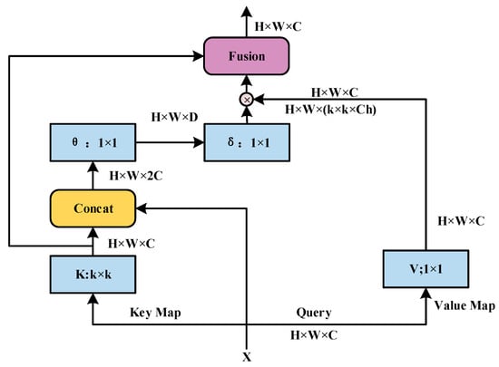 The COT attention mechanism module enhances feature representation by fusing static and dynamic contexts. The module first performs a k × k convolution operation on the input feature map to extract local static context information, denoted as K1. The static context K1 is then concatenated with the query vector Q. The dynamic multi-head attention weight matrix is generated by two 1 × 1 convolutional layers. Unlike the traditional self-attention mechanism, this method is based on a local correlation matrix at each position. This method reinforces attention learning through the interaction between queries and keys while integrating static context. Subsequently, the dynamic attention weight matrix is multiplied by the value vector V, processed via a 1 × 1 convolution, to obtain the global dynamic context information denoted as K2. Ultimately, the model’s ability to capture spatial relationships in the feature map is significantly enhanced by fusing the static context K1 and the global context K2, enabling effective modeling of dynamic dependencies among the input features. The fusion of local static and global dynamic contexts allows the model to better capture spatial symmetries that frequently appear in solar panel defect patterns, such as bilateral or radial symmetry, thereby improving symmetry-aware contextual representation.