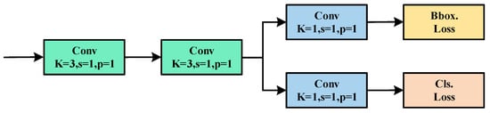To this end, this paper designs a lightweight detection head, Detect-Efficient, which optimizes the utilization of computing resources and improves the detection accuracy and speed of the model. Detect-Efficient first performs feature extraction through a 1 × 1 convolution and a 3 × 3 convolution and then divides into two branches. Each branch performs a 1 × 1 convolution and calculates Bbox.loss and Cls.loss, respectively, and the structure is shown in Figure 8. Detect-Efficient has lower computational complexity than YOLOv8’s detection head.