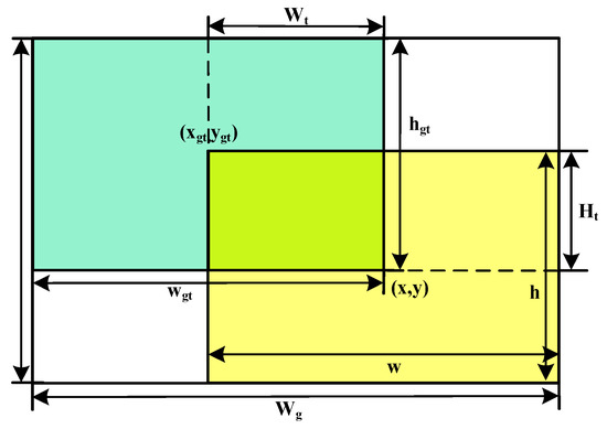 For the object detection task, IoU is used to measure the overlap between the ground truth bounding boxes and the predicted bounding boxes. The data used to calculate IoU is shown in Figure 9. To clarify the equations used, the variables involved are defined as follows: Wt and Ht are the width and height of the intersection area between the target and prediction frames; w and h are the width and height of the prediction frame; wgt and hgt are the width and height of the target frame; (x, y) are the prediction frame’s center coordinates; (xgt, ygt) are the target frame’s center coordinates; Wg and Hg are the width and height of the smallest bounding frame that contains both the prediction and the target frames. All the above variables are illustrated in Figure 9.