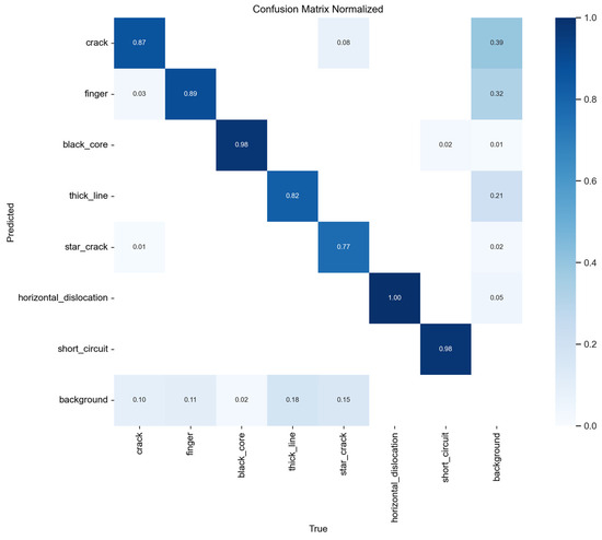 The results of the confusion matrix for DCE-YOLO are shown in the figure, which visualizes how the model performs on the data. In addition to the seven types of defects, the figure includes background categories. Each row represents the actual category, while each column represents the predicted category. The rightmost column shows the total misdetection probability for each type. The last row represents the total missed detection probability. Taking crack as an example, the correct prediction rate is 87%, with a 10% missed detection rate. The probabilities of being misclassified as finger and star crack are 3% and 1%, respectively. The main diagonal of the confusion matrix represents the probability that predicted categories align with actual categories. Values closer to 1.0 indicate superior model performance. Figure 10 demonstrates that five categories achieve correct prediction probabilities of 85% or higher, confirming the accuracy of the proposed model.
