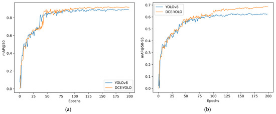 The performance comparison results of DCE-YOLO and YOLOv8 under the same parameter settings (input resolution 640 × 640 px) and training conditions are shown in Figure 11. Experiments show that DCE-YOLO initially demonstrates slightly lower mAP@50 and mAP@50-95 than YOLOv8 during early training stages. However, DCE-YOLO shows significant advantages in later training stages. The mAP@50-95 improvement is particularly significant, which verifies the effectiveness of the proposed method. In addition, DCE-YOLO performs better in detection accuracy and shows better training stability. Its training curve has more minor fluctuations and is smoother in the interval of 50–150 epochs. With the increase of training rounds, the performance advantage of DCE-YOLO continues to expand and stably maintains the lead in the later stage of training. The experimental results fully prove that DCE-YOLO effectively improves the comprehensive detection performance of the model.