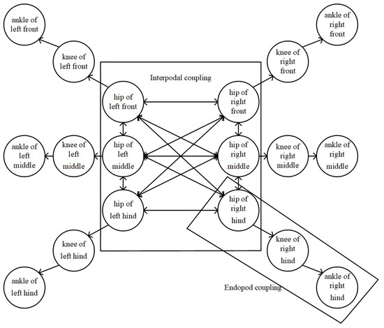 In a mutually coupled network, multiple CPGs contain both coupling relationships in the time domain and the spatial domain. For the 18 degrees of freedom of the hexapod robot to realize forward motion, this paper adopts 18 CPG units to control the hip, knee and ankle joints of the six legs, respectively. The 18 oscillators can be categorized into inter-leg coupling and intra-leg coupling to construct a hierarchical CPG control network. As shown in Figure 1, each hip, knee and ankle joint of the robot is represented by one oscillator, and the left and right joint structures are symmetric to each other.