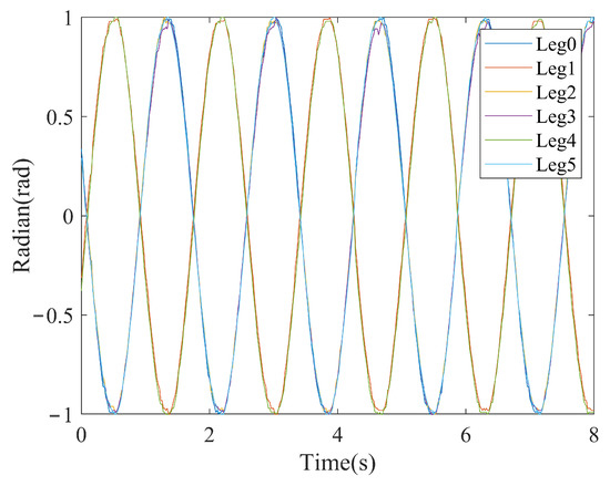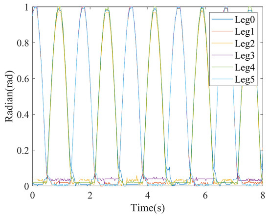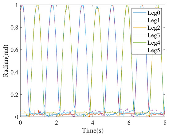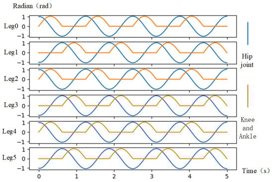 As illustrated in Figure 2, these two leg groups alternate between stance and swing phases to propel the robot forward, maintaining a constant ratio of three legs in stance phase while the other three execute swing phase at any instant. The inter-group phase difference is set to with a 0.5 duty cycle, yielding gait parameters = . Within each leg, unidirectional coupling propagates signals from hip to knee, and subsequently to ankle joints.The CPG-generated joint trajectories for the tripod gait are shown in Figure 3, where the x-axis is time and the y-axis is the joint trajectory signals generated by each CPG unit, which demonstrates variation in each CPG signal over time. Figure 4, Figure 5 and Figure 6 show the joint motion trajectory signals captured by a hexapod robot moving in the real world, where the x-axis is time and the y-axis is the joint trajectory signals of the hip, knee and ankle joints of each leg, which basically coincides with the CPG signals.