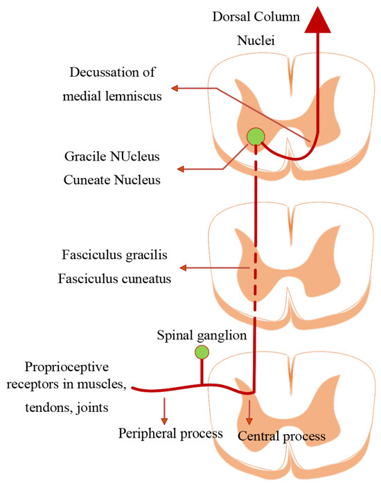 Unlike exteroception, proprioception relies on internal sensors to obtain sensory information from within the body. These internal sensors are called proprioceptors, and they send information to the body about muscle length, tension, and joint angles. The proprioceptors send signals to the brain through the nervous system. For example, a person can put food in his or her mouth even when his or her eyes are closed, as well as feel his or her surroundings with his or her hands and feet and waddle forward. Simple or complex movements such as walking, running, and playing basketball require proprioception [20]. The common motor faculty proprioceptors are the muscularis oculi, Golgi tendon apparatus, annulus laminaris, and Ruffini’s vesicles, which sense the speed and direction of joint motion and joint position and transmit them to the brain through the conduction pathway. The proprioceptive conduction pathways of the trunk and limbs are shown in Figure 7.
