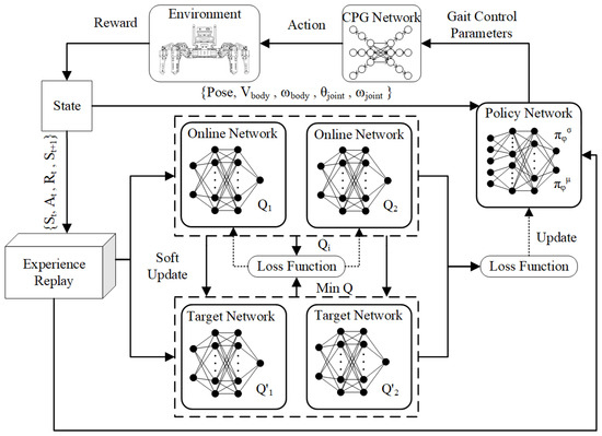 The locomotion control of the hexapod robot is formulated as a Markov Decision Process (MDP), satisfying the fundamental requirements for reinforcement learning applications. In this study, we employ the Soft Actor-Critic (SAC) algorithm to train a parameterized motion policy network, which is particularly suitable for this continuous control task due to its maximum entropy framework. As an off-policy deep reinforcement learning algorithm, SAC incorporates entropy maximization into its objective function, achieving an optimal balance between exploration and exploitation [30]. This approach demonstrates superior robustness and sample efficiency compared to conventional methods, while providing stable convergence properties for continuous action space control problems [31].