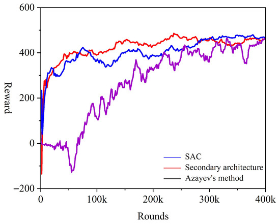 The structure of the trained strategy network is as follows: the number of input nodes is 46, the number of nodes in both hidden layers is 256, and at the end the number of nodes in the output layer is 2. Table 1 shows the parameters set during training. The final training process is shown in Figure 10. It takes about 7–8 h to train a strategy network model.
