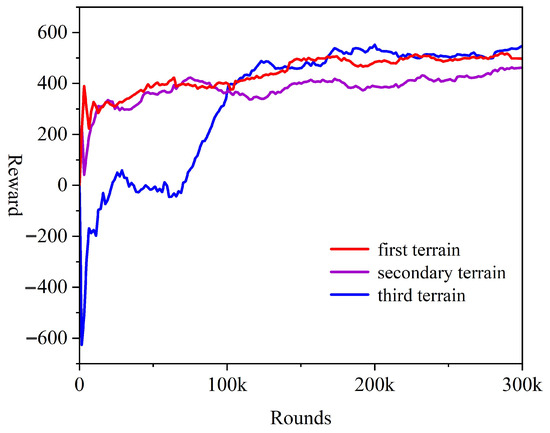 This study employs a hierarchical training architecture for the hexapod robot, with the learning performance across three distinct terrains illustrated in Figure 12. The training curves demonstrate stable convergence for all terrain types, though the convergence rates vary according to terrain complexity. These results validate that our proposed method successfully achieves robust locomotion control for the hexapod robot traversing diverse rugged terrains, as evidenced by the consistent policy convergence regardless of environmental difficulty. The empirical findings confirm the method’s effectiveness in meeting the control requirements for adaptive walking in unstructured environments.