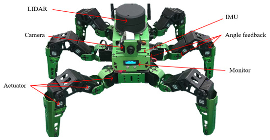 The current environmental perception capability of hexapod robots is mainly obtained by acquiring 2D or 3D images using external sensors such as visual sensors or LiDAR. Reference [8] proposed a robot–terrain interference model based on visual sensors, joint torque, and inertial measurement unit (IMU) information, which significantly improved the off-road capability of legged robots. The authors of [9] designed a hexapod robot called “Weaver”, which uses terrain perception based on stereo vision and proprioception for adaptive control, and visual–inertial odometry for waypoint-based autonomous navigation. However, for hexapod robots that frequently perform tasks such as field transportation and reconnaissance, low visibility and adverse weather conditions—such as fog or rain—significantly impair the performance of external sensors.