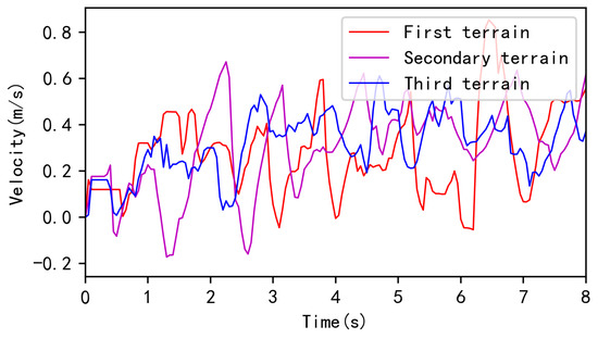 A critical objective in hexapod robot training is maintaining consistent locomotion velocity across varying terrains. To evaluate this capability, we set a uniform target speed of 0.1 m/s during training for all three terrain types, as demonstrated in Figure 15. On all three terrains, the robot starts from a stationary position, thus the initial speed is 0 m/s. Terrain 1 is relatively flat, and the hexapod robot in this terrain only needs about 1.2 s to accelerate to the target speed of 0.4 m/s. Terrain 2 is more rugged, and the hexapod robot needs 1.9 s to accelerate to the target speed. Terrain 3 is rugged and has the resistance of grass, which results in the longest acceleration time, requiring 2.7 s to reach the target speed. After accelerating to the target speed, the hexapod robots on all three terrains oscillate near the target speed, which is consistent with the movement patterns of hexapod robots on rugged terrains. The experimental results show that this control architecture allows the hexapod robot to maintain a stable walking speed on various unstructured terrains.