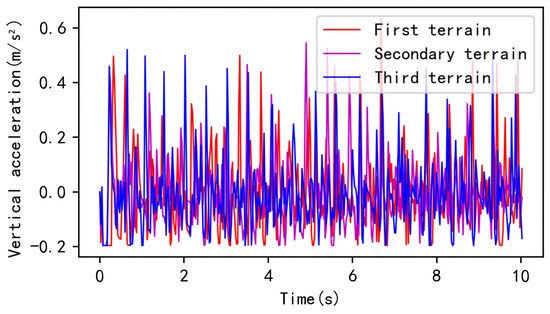 Overall, the vertical acceleration, the angular acceleration of the traverse angle and the angular velocity of the pitch angle of the hexapod robot in these three terrains are stable with stable frequencies and small standard deviations of the amplitudes and magnitudes, which are more stable. The experimental results show that the control architecture enables the hexapod robot to maintain a stable gait in a variety of unstructured terrains.