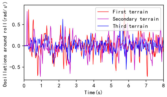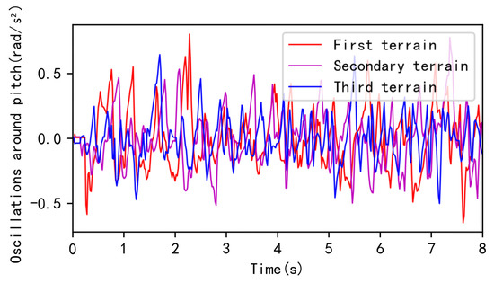 Figure 18 displays the pitch angular acceleration characteristics of the hexapod robot across the three terrain conditions. The measured values oscillate symmetrically around with amplitudes consistently bounded between and . Quantitative analysis shows standard deviations of (Terrain 1), (Terrain 2), and (Terrain 3), as detailed in Table 3. Notably, all terrains exhibit similar oscillation patterns in both amplitude and frequency, with Terrain 3 demonstrating the most stable pitch dynamics. The consistently small magnitude of angular accelerations (below 0.8 rad/s2) indicates excellent pitch stability during locomotion, further validating the robustness of the control system across varying terrain conditions.