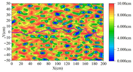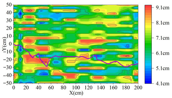 We employ contour mapping to visualize the hexapod robot’s locomotion trajectory, with the maximum yaw deviation within a defined 100 × area serving as a quantitative measure of straight-line walking capability. Figure 19 illustrates the movement path in Terrain 1, where the purple curve traces the robot’s center-of-mass trajectory, while the color gradient (red to blue) represents terrain elevation variations corresponding to the reference colorbar. Quantitative analysis reveals a maximum yaw deviation of in this terrain—the smallest observed among the three test environments—demonstrating superior straight-line walking performance compared to more challenging terrains. This precision in path following, combined with the minimal lateral deviation, confirms the effectiveness of our control architecture in maintaining directional stability on moderately uneven surfaces.