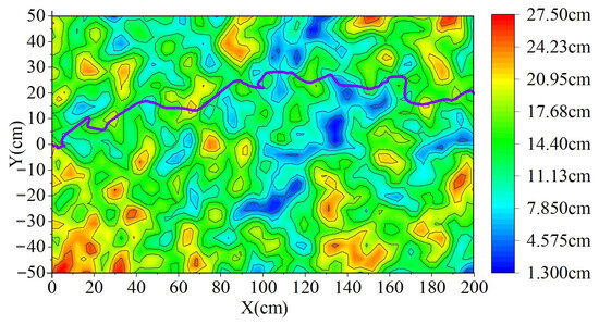 The motion path of the hexapod robot in Terrain 2 is shown in Figure 20, the terrain is a gravel road full of stones, with relatively large ups and downs, and its maximum yaw distance is . The motion path of the hexapod robot in Terrain 3 is shown in Figure 21, the terrain is full of grasses whose height is greater than the height of the hexapod robot, but because the grasses are flexible objects, the hexapod robot can easily pass through the grasses, the grasses are hidden in the figure, only the information on the terrain is retained, and the maximum yaw distance is .