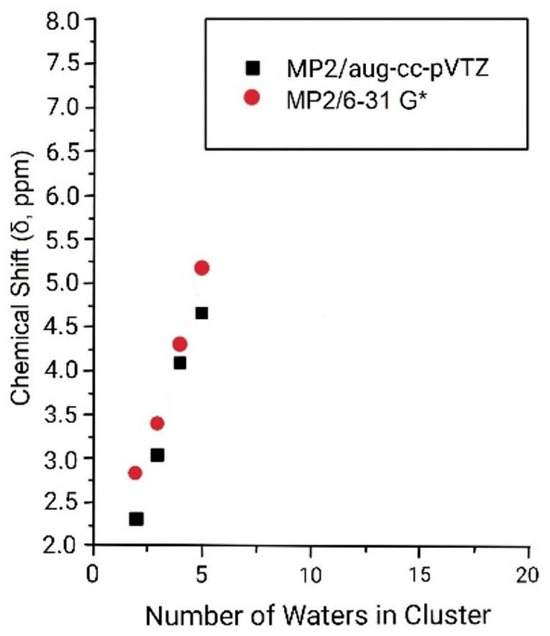 Table 2 presents the computed average chemical shifts for modeled water clusters (assuming fast exchange) at the GIAO/SMD/MPW1PW91/6-311+G-(2d,p)//MP2/CBS-e level of theory. The MP2/CBS-e geometries were obtained from references [15,16].