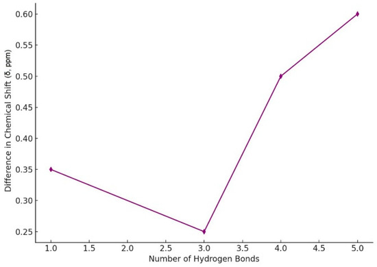 Figure 2 presents the GIAO-DFT-calculated chemical shift values (δ, ppm) a function of the cluster size (n = 2–5), with n plotted along the X-axis and δ along the Y-axis. Table 2 lists the corresponding δ values and the corresponding number of hydrogen bonds for each cluster. An exponential increase in δ is observed for n = 2–4, with a trend toward saturation at n = 5, indicating nonlinear and cooperative interactions within the hydrogen bond network. Table 4 compares different fitting models. The exponential model provides an exponential trend for n = 2–4. Linear and logarithmic approximations applied to larger clusters and hydrogen bond counts showed lower accuracy.