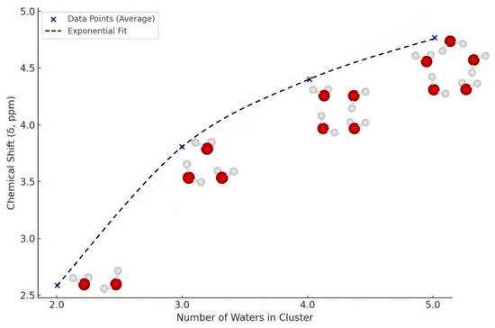 The chemical shift continues to rise exponentially with the inclusion of pentamers (H2O)5. This supports the analysis that n = 5 marks a critical point in water clusters’ structural and energetic cooperativity [4,7]. Both computational methods exhibit a consistent exponential increase up to this point, rather than a plateau, indicating that cooperative hydrogen bonding continues to strengthen through the fifth molecule.