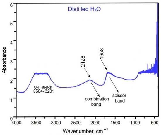 The water samples were analyzed using Fourier-transform infrared (FT-IR) spectrometry. The FT-IR spectra in our study were recorded with a “Thermo Nicolet Avatar 360 FT-IR” spectrometer (Waltham, MA, USA), equipped with a DTGS detector in the region 400–4000 cm−1, accumulating 64 scans at a spectral resolution of 2 cm−1 [26]. The experiments were performed at 298.15 K. All measurements were conducted at the Institute of General and Inorganic Chemistry, Bulgarian Academy of Sciences (BAS), Sofia, Bulgaria.