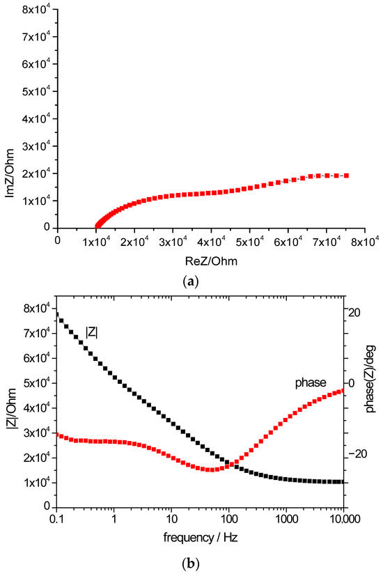 Complex electrical impedance spectroscopy (EIS) provides valuable information on distilled water’s ionic conductivity and polarization dynamics. The Nyquist plot (Figure 6a) reveals a characteristic semicircle, indicating that the water layer can be further modeled as a parallel combination of bulk resistance and capacitance.