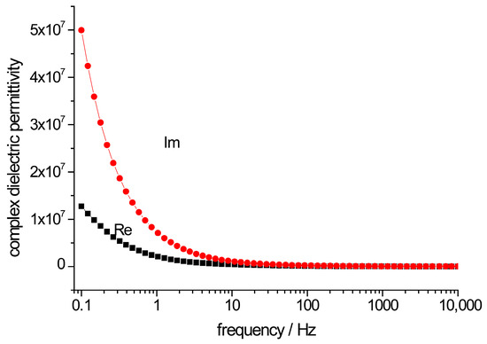 The electrical conductivity studies were conducted at 298.15 K using BioLogic potentiostat/galvanostat (SP-200) (Claix, France). Complex electrical impedance spectroscopy [27] was applied in the 0.1 Hz–10 kHz frequency range, similarly to in our previous studies [13,28,29]. For the ionic conductivity and permittivity measurements, 20 µL distilled water was placed between two parallel flat round copper plates, constituting a plane electric capacitance with a gap of 1 mm. The plate diameter was 10 mm.