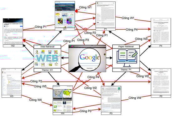 Semantic correlation is a fundamental concept in natural language processing (NLP) and information retrieval and describes the degree of association between two or more semantic primitives (e.g., words, phrases, or documents) at the semantic level. Unlike simple word matching, semantic correlation captures deeper meanings and contextual relationships within textual data [11,39,40]. Mainstream methods such as word–vector models primarily learn word semantics through neural networks, mapping words into high-dimensional vector spaces where semantic correlation is assessed via vector similarity metrics [11,41,42]. In recent years, deep learning-based models (e.g., bidirectional encoder representations from transformers (BERT)) have significantly enhanced the accuracy of semantic correlation calculations by leveraging large-scale pretraining [10,43]. As a result, semantic correlation analysis has been widely applied across NLP tasks such as machine translation, text mining, and question-answering systems [11,41,43]. More importantly, recent studies indicate that semantic correlations within domain-specific texts can reveal key insights into the evolution of thematic trends in various fields [44,45]. For example, in the domain of information retrieval, information asymmetry often leads users to utilize search engines to access the information they need. Figure 2 illustrates this dynamic retrieval process: a user initially accesses paper P1 but later transitions to reading P4, which is more relevant and up-to-date. P4 is subsequently cited by web article W4, leading them to explore W4, thereby accelerating the dissemination of both P4 and W4. This retrieval path highlights the role of semantic correlation in knowledge dissemination and thematic evolution.