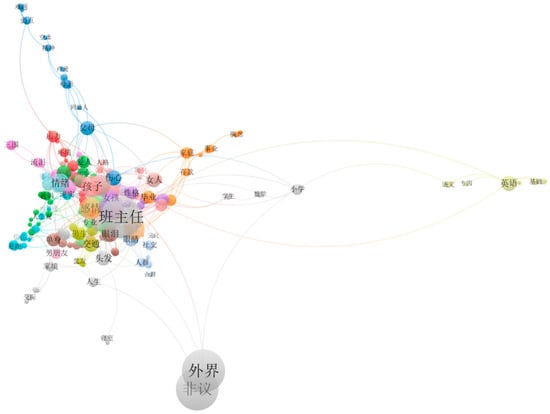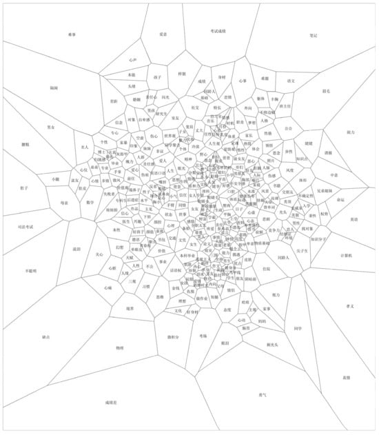 Figure 6 presents the geospatial-analogous semantic model based on the experimental data. The entire semantic space is divided into a series of non-overlapping polygonal regions, each corresponding to a specific semantic primitive. Compared with traditional semantic analysis models, such as the co-occurrence network model (Figure 7), the geospatial-analogous semantic model defines the semantic scope of each primitive through clear polygonal boundaries, resulting in distinct and recognizable semantic demarcation lines. The Chinese semantic primitives in the figure are translated into English in Appendix A.