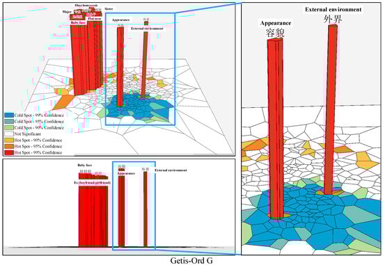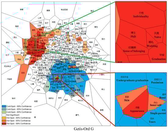 The local Getis-Ord G clustering map (Figure 8) reveals the spatial distribution patterns of semantic hotspots and coldspots. On the basis of confidence intervals, three significant levels emerge: red hotspot areas, concentrated in the left and upper-left regions, where related semantic primitives exhibit high-intensity clustering. Representative primitives such as 个性 (individuality), 博士 (PhD), and 婚礼 (wedding) reflect positive social attributes. In contrast, blue coldspot areas, occupying the lower-right and central regions, feature low-value clusters of primitives such as 本科毕业 (undergraduate graduation) and 悲观 (pessimism), which indicate negative emotional tendencies. The transitional zones display a random distribution without significant clustering patterns. This finding supports the hypothesis that semantic spaces exhibit polarity-based spatial differentiation [9,77,78].