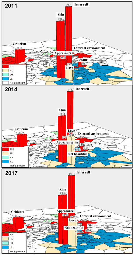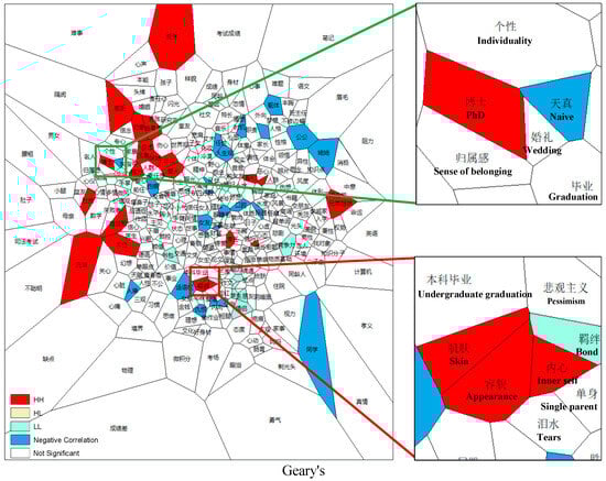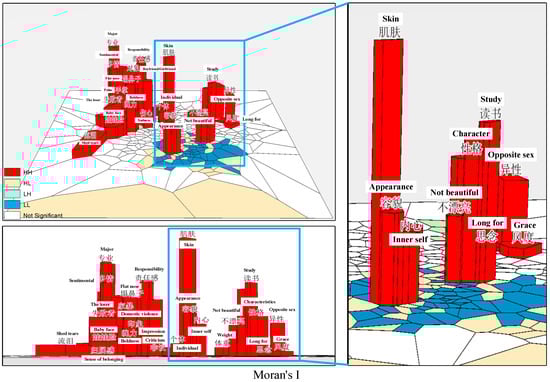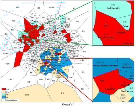 The local Moran’s I analysis (Figure 9) further reveals the structural characteristics of spatial correlation. Four clustering patterns emerge in a gradient-like distribution: HH clusters (red) and LL clusters (blue) dominate the left and lower-right regions, respectively, forming a spatial opposition between positive semantic primitives (e.g., 博士 (PhD), 归属感 (sense of belonging)) and negative semantic primitives (e.g., 悲观 (pessimism), 理想 (ideal)). Notably, HL/LH clusters, which serve as transitional zones, are distributed along clustering boundaries, where primitives such as 单亲 (single parent) and 责任 (responsibility) have a semantic inhibitory effect on their surroundings. This core-periphery structure reveals the hierarchical relationships and propagation dynamics within the semantic network [8,58,72,78].