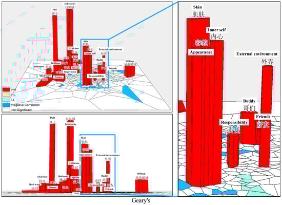 The local Geary’s C clustering map (Figure 10) presents a different perspective from local Moran’s I, omitting the low-high clustering (LH) category while incorporating a negative correlation type. In Figure 10, the HH clusters (red) are primarily concentrated in the upper-left and central regions, especially around semantic primitives such as 空虚 (emptiness), 印象 (impression), and 非议 (criticism). These areas exhibit high-value heterogeneity, reflecting core expressions and direct experiences related to inferiority, such as emotional fluctuations and negative sentiment articulation. Conversely, LL clusters are more widely distributed in the lower-right region, covering positive emotions and contextual variables rather than core drivers of self-abasement. Additionally, the Geary’s C classification results highlight boundary characteristics between regions. The transition zones between the HH and LL clusters exhibit significant heterogeneity, reflecting a semantic shift from core emotional drivers to contextual variables. These findings demonstrate that Geary’s C effectively captures local variations and boundary features in semantic space, providing a detailed analytical framework for understanding the complex spatial-semantic patterns of inferiority and their variable interactions [61,62,63].