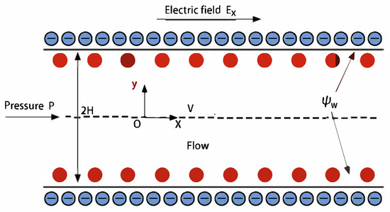 The EOF of Powell–Eyring fluid within a parallel microchannel is presented. A Cartesian coordinate framework is set up parallel to the pipe’s central axis. The two plates are positioned at and , respectively, separated by a distance of . Moreover, the assumed electric field is , with the pressure gradient remaining a fixed constant. Geometrical symmetry dictates that solely the channel’s upper segment is taken into account, i.e., the region . Figure 1 depicts the problem’s schematic. Table 1 outlines the variables and parameters applied in the current investigation.