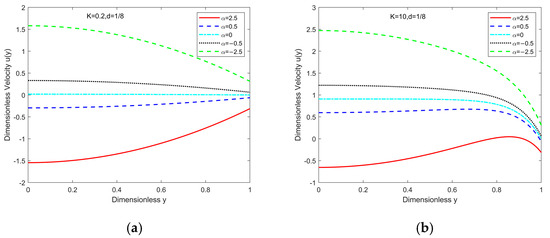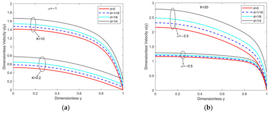 Figure 3 demonstrates the dependence of the velocity distribution on the pressure gradient-to-electric field ratio . When , the image of velocity change is given in Figure 3a. When , the image of velocity change is shown in Figure 3b. Observation reveals that when , i.e., the pressure gradient satisfies , the flow is exclusively influenced by the electric field force. At this point, except for the boundaries, the flow velocity is similarly linearly distributed. When is small, electroosmosis plays a dominant role, and the nonlinear effects are mainly manifested within the EDL, having a smaller impact on the overall velocity distribution. Figure 3a demonstrates considerable EDL thickness and substantial velocity distribution alteration due to the EDL’s impact. At this point, the velocity profile is parabolic in shape. In Figure 3b, it is evident that the thickness of the EDL is small, and the velocity is less influenced by the EDL. As increases, i.e., the pressure gradient increases, the Powell–Eyring fluid’s shear-thinning effect becomes more pronounced in the central region. The shear rate increases, viscosity decreases, flow resistance decreases, fluid fluidity enhances, and the top of the velocity profile becomes flatter (similar to “plug flow”).