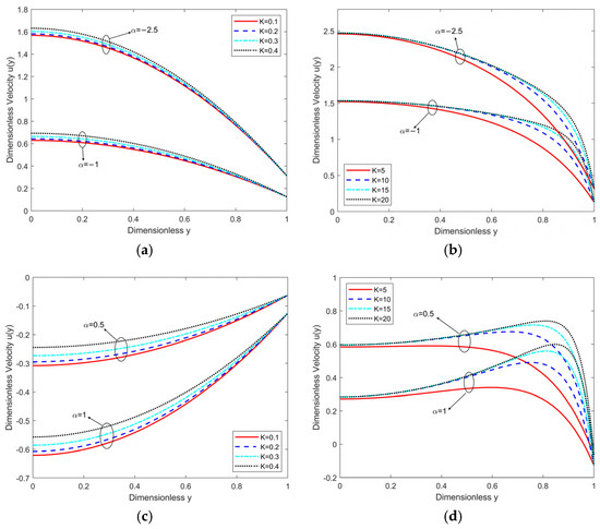 (a): Dimensionless velocity distribution with , , , , for and ; (b): dimensionless velocity distribution with , , , for and ; (c): dimensionless velocity distribution with , , , for and ; (d): dimensionless velocity distribution with , , , for and .